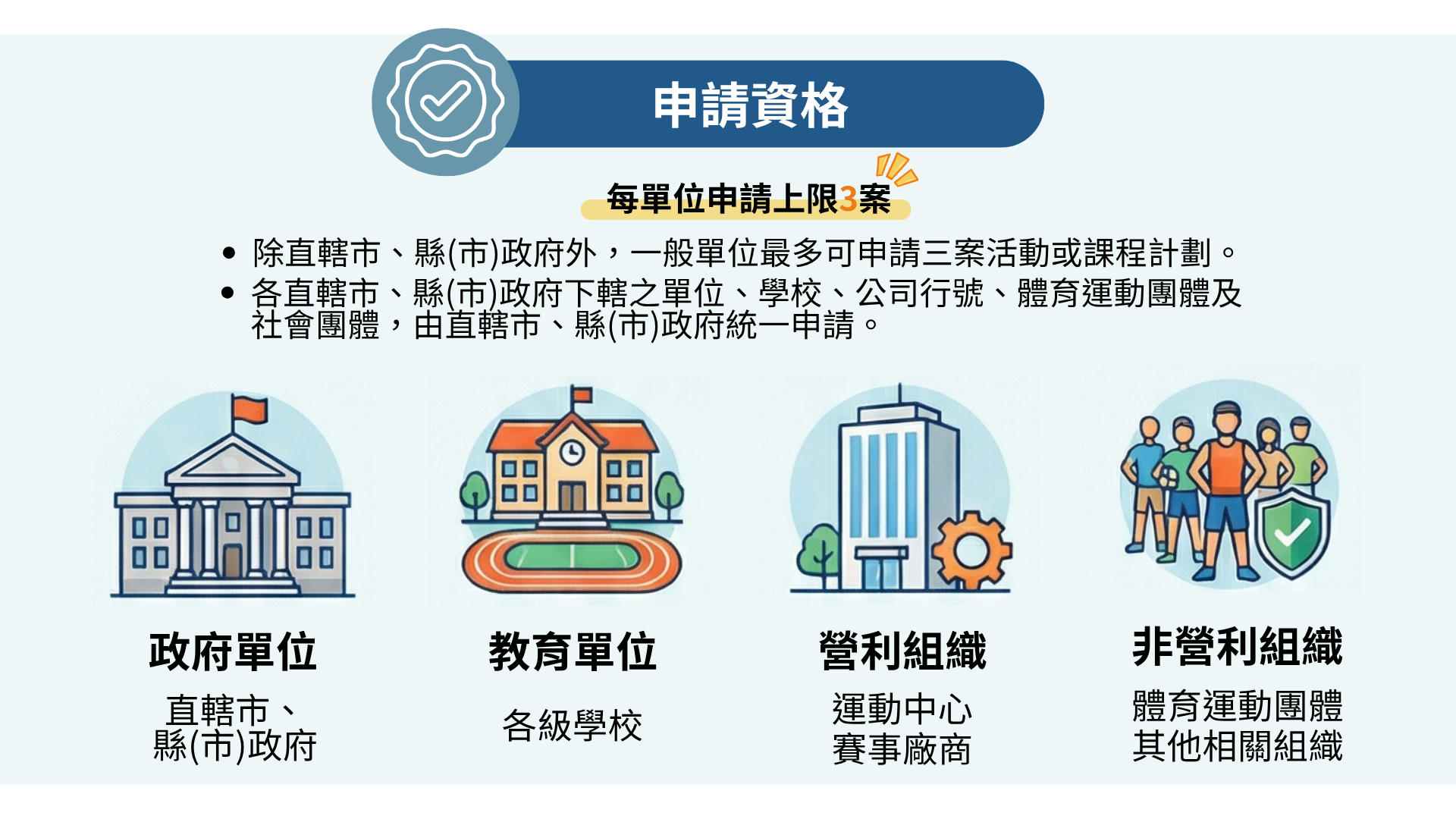 A4. 每一申請單位以申請 3案 為上限(縣市地方政府不在此限) 。若已獲得運動部全民運動署補助之活動,不得重複申請本計畫 。