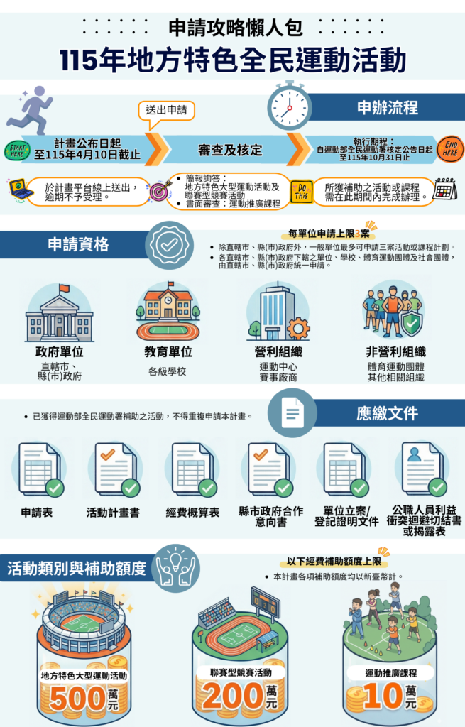 為協助各單位快速掌握申請重點,我們特別整理了「申請攻略懶人包」,包含流程、資格及補助額度,歡迎下載參考。